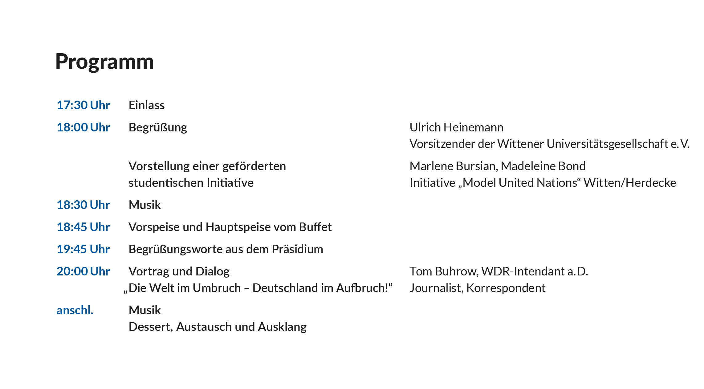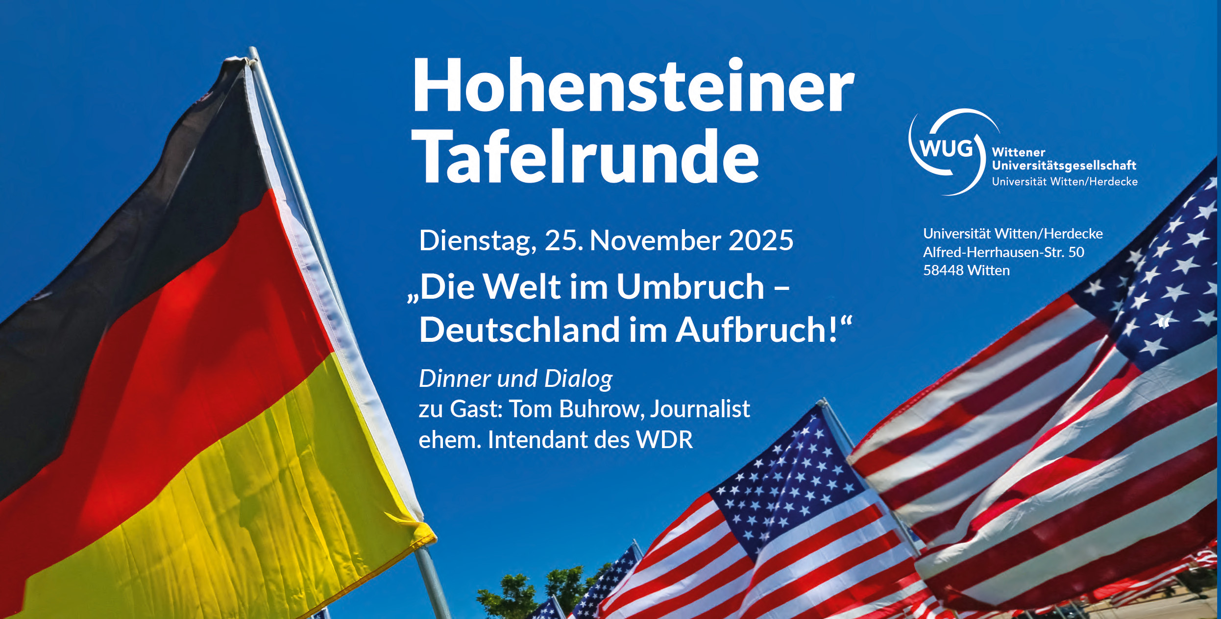 Für die Hohensteiner Tafelrunde am Dienstag, 25. November 2025 ist es uns gelungen, Tom Buhrow, den ehemaligen Intendanten des WDR, als Festredner zu gewinnen. Das Thema seines Vortrages lautet: „Die Welt im Umbruch – Deutschland im Aufbruch!“.